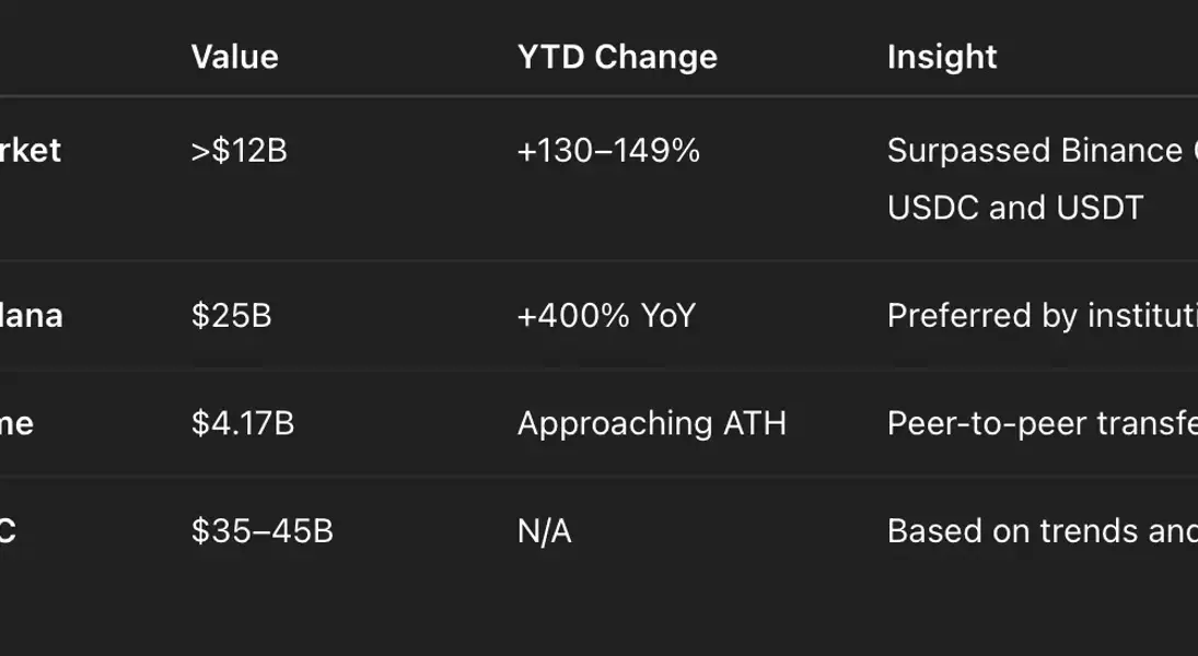 Solana's stablecoin market has undergone a significant transformation throughout 2025, driven by its high-performance blockchain infrastructure. The total market capitalization has surged to over $12 billion, marking a substantial increase from approximately $5 billion at the beginning of the year. This expansion is powered by escalating transfer volumes, the launch of innovative stablecoins, and deep integrations with leading decentralized exchanges, creating a dynamic and highly liquid environment for digital assets. The platform's appeal extends to a broad spectrum of users, from institutional adopters seeking efficiency to DeFi protocols and payment systems leveraging Solana's cost-effective and swift transaction capabilities.